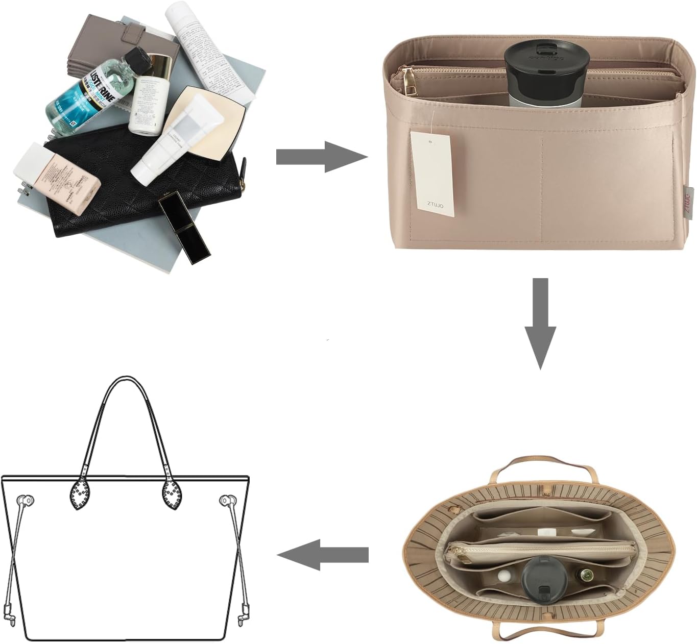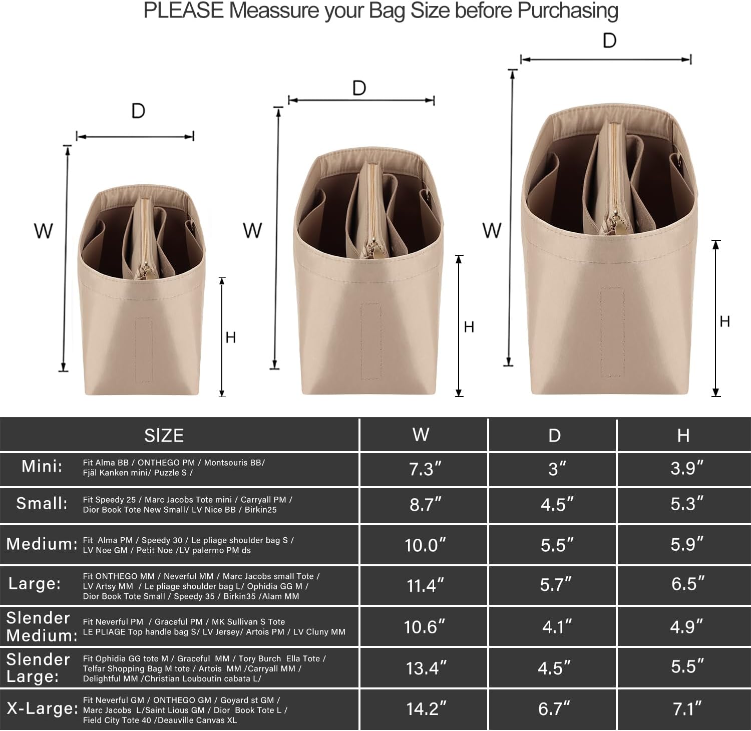 Step 2: Check the SIZE CHART again and select an organizer that is slightly smaller than your bag