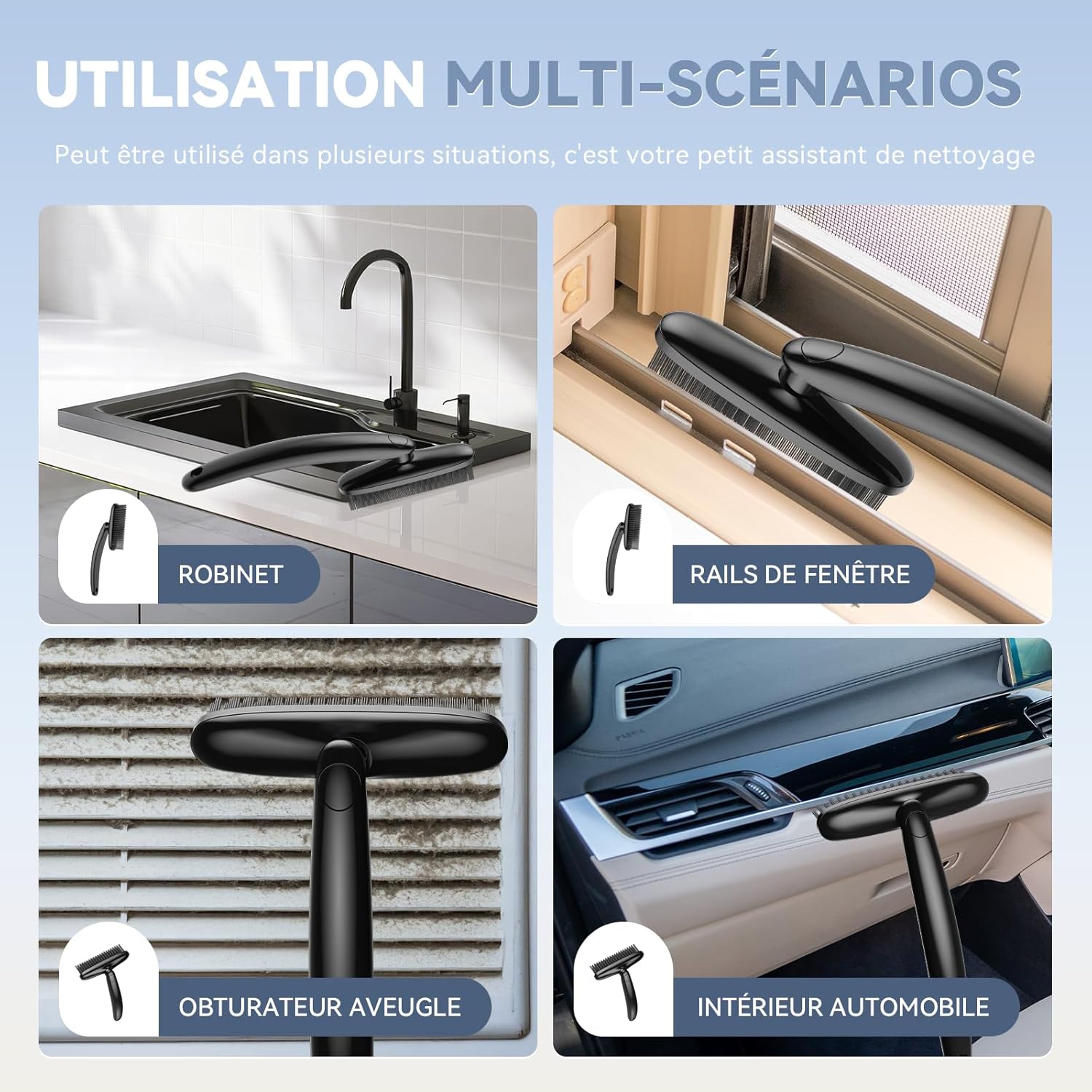 All Purpose Brushes: Suitable for cleaning various surfaces like sink, window track, blind, door track, faucet, car, stovetop, grout lines, basin, floor, keyboards, tub, vents, pool, vehicle, furniture, boat, countertop, microwave, coffee maker, shower door frames, fans, shoes, sneaker, oven, washing machine, toilet tank baseboard, toilet bowl and more.