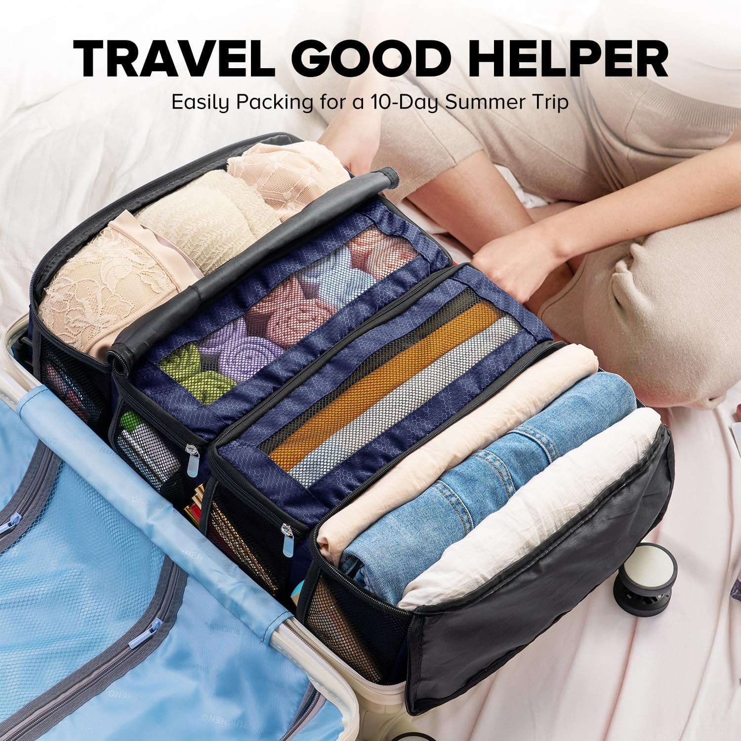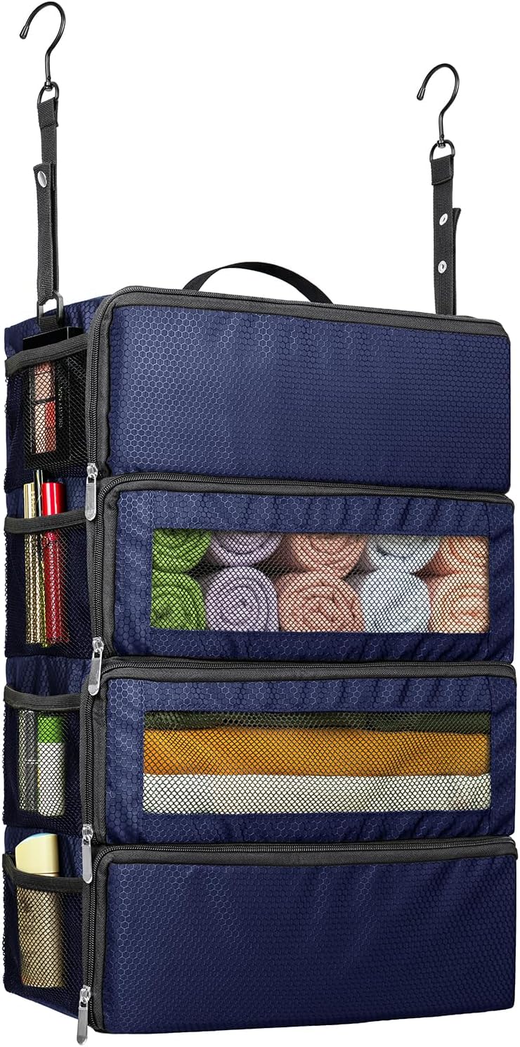 Customers find the luggage organizer well-made with strong hooks and appreciate its design, particularly how it hangs nicely in hotel closets. The storage capacity is positive, with pockets on the sides holding items like wipes, and customers find it easy to pack and unpack. They like how it keeps everything organized and consider it worth the price. The size receives mixed feedback, with some finding it fits nicely in luggage while others say it’s extremely small.