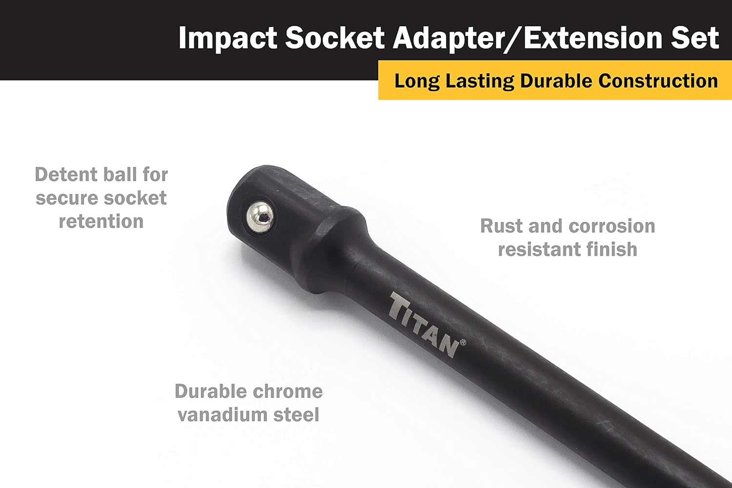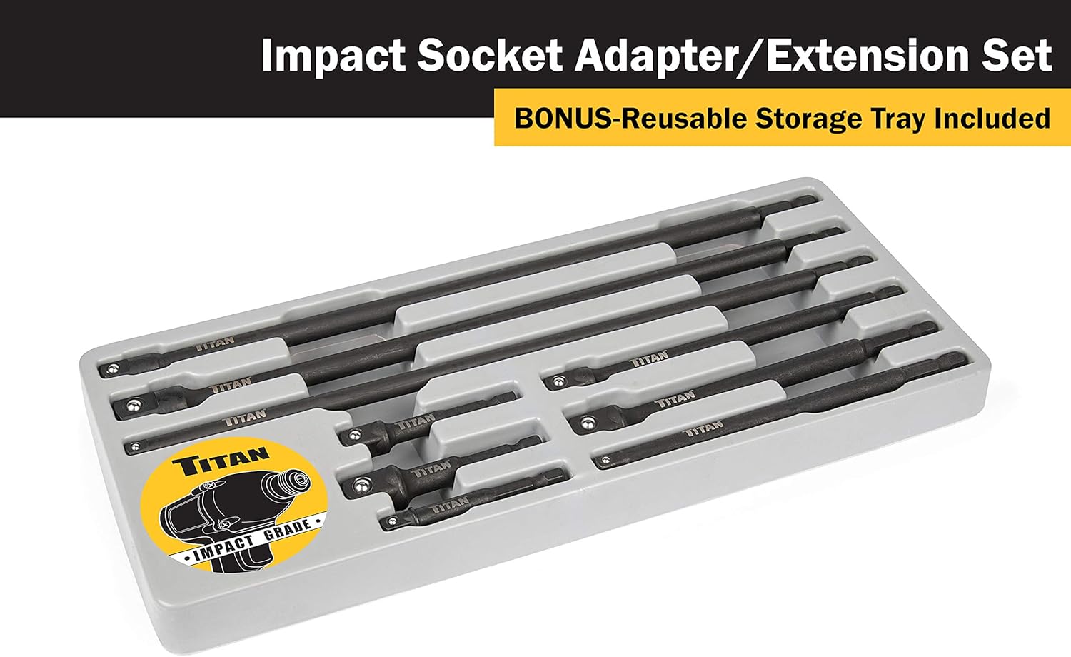 Titan 12089 9-Piece Impact Socket Adapter and Extension Set includes (3) 1/4-Inch, (3) 3/8-Inch, and (3) 1/2-Inch Drive impact grade socket adapters. Each drive size has an overall length of 2-3/4-Inch, 6-Inch, and 12-Inch. Socket adapter is constructed of chrome vanadium steel with black phosphate finish to protect against rust and corrosion. Adapts sockets to power drills and drivers. Features a detent ball design for secure socket retention. Socket adapters are impact grade. Shank is 1/4-Inch. Made in Taiwan.