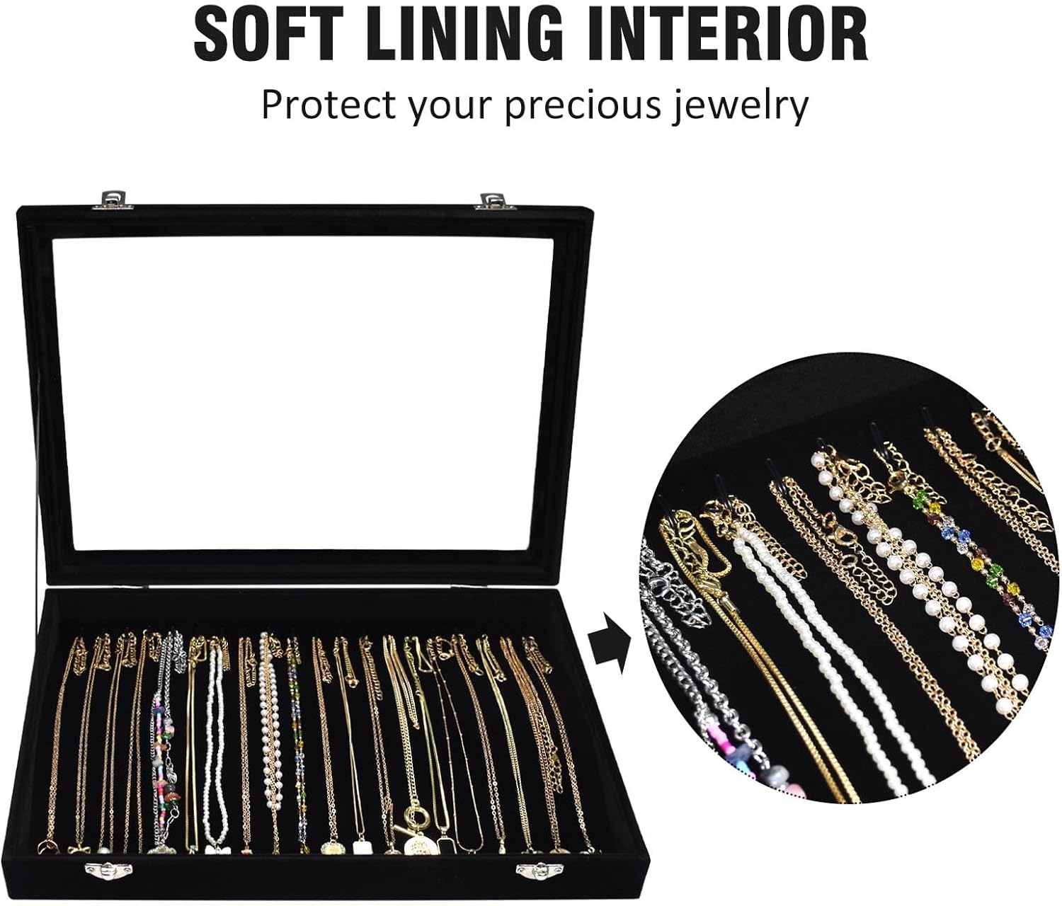 Design concept: The Vicoter 20 hook necklace jewelry display storage box can effectively distinguish necklaces, protecting your precious necklaces from dust, entanglement, and wear. Through the transparent glass cover design, you can quickly find the necklace you are looking for. Two safety locks can effectively prevent the cover from being easily opened.