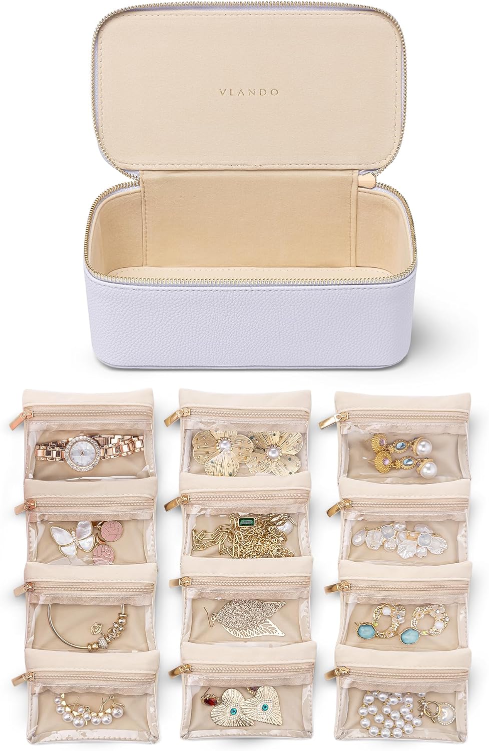 Lychee grain leather jewelry storage box, including 12 velvet transparent storage bags, can be carried separately or placed inside the jewelry box storage, to prevent jewelry oxidation affect the use