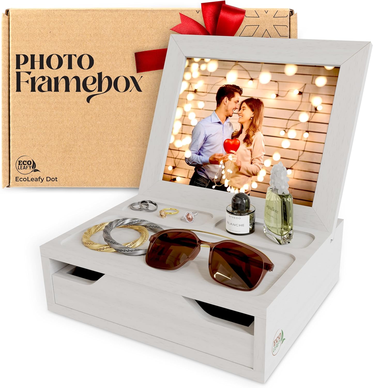 Wood Photo Framebox – Best Birthday Gift For Girlfriend, Woman, Daughter, Mom or Wife – Wooden Photo Box for Sunglasses, Keepsakes, Watches, Bracelet, Accessories (White)