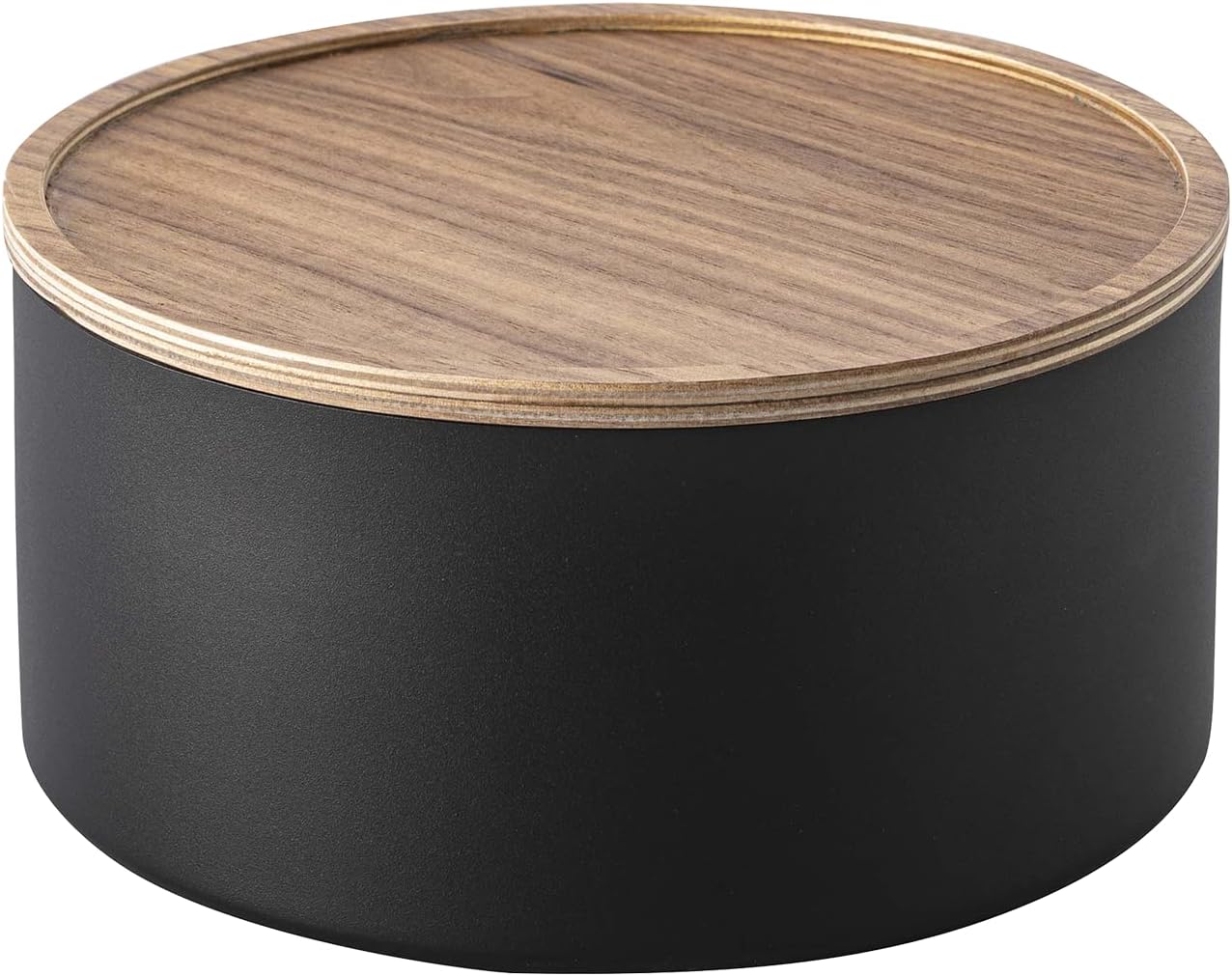 An all-*round best bin., Stack up on this delightful and unique round design, sure to spruce up any everyday assortment, from your tea snacks, sewing kit, or jewelry collection. The wooden lid brings a warm aesthetic that balances the modern steel construction, and doubles as a handy tray to keep your buttons and bobbins from rolling away, or place to stash your go-to earrings and chains., Choose the deeper version for bulkier items or larger collections, and the shallow version for smaller assortments and better visibility.